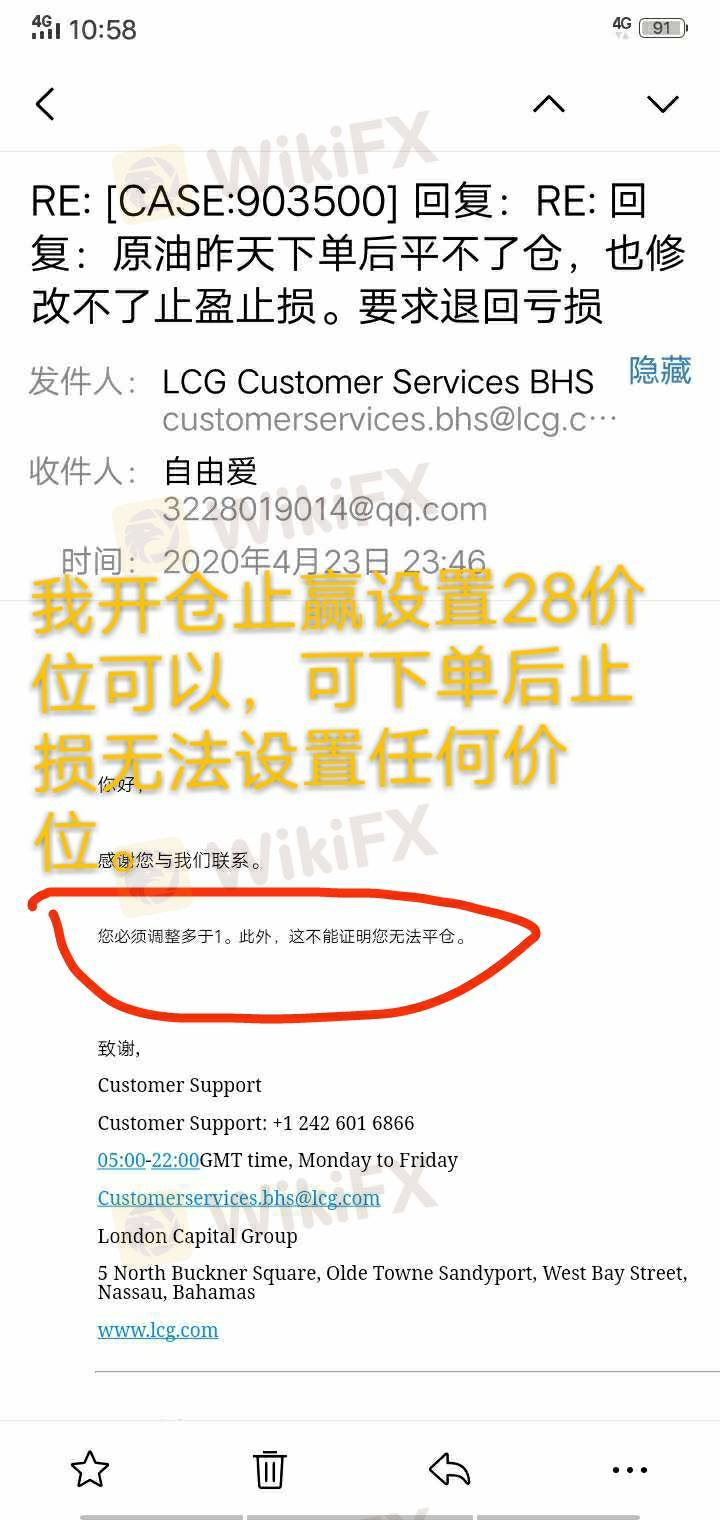 我在lcg平台20日晚上22点钟开户成功入金14121元,23点钟开第一个单子原油10.8多单,下单后我马上设置了一个止盈28价位,后来我想再设置一个止损在10价位,可手机一直设置不了止损,也平不了仓,万般无奈下我录了当时一个视频无法操作设置止损和平仓。同是在的单子没有爆仓前发微信给LCG客服经理多次,说原油单子无法操作止损和无法操作平仓,没有回复微信。 lcg平台无权干涉客户止损设置必须大于1的位置,再说当天下单后我设置大于10位置设置,止赢止损开单前原油期货设置下单位置10.8开仓,止赢28,止损10,可单子开仓成功止赢28有,止损10就没有,我就马上加设止损10可操作了几次没有成功。我就录几个当天视频做为交易证据,铁一般事实,无权干涉取消客户止损和无权干涉客户止损必须大于1位置,无权干涉客户不让客户设置止损及平仓操作。