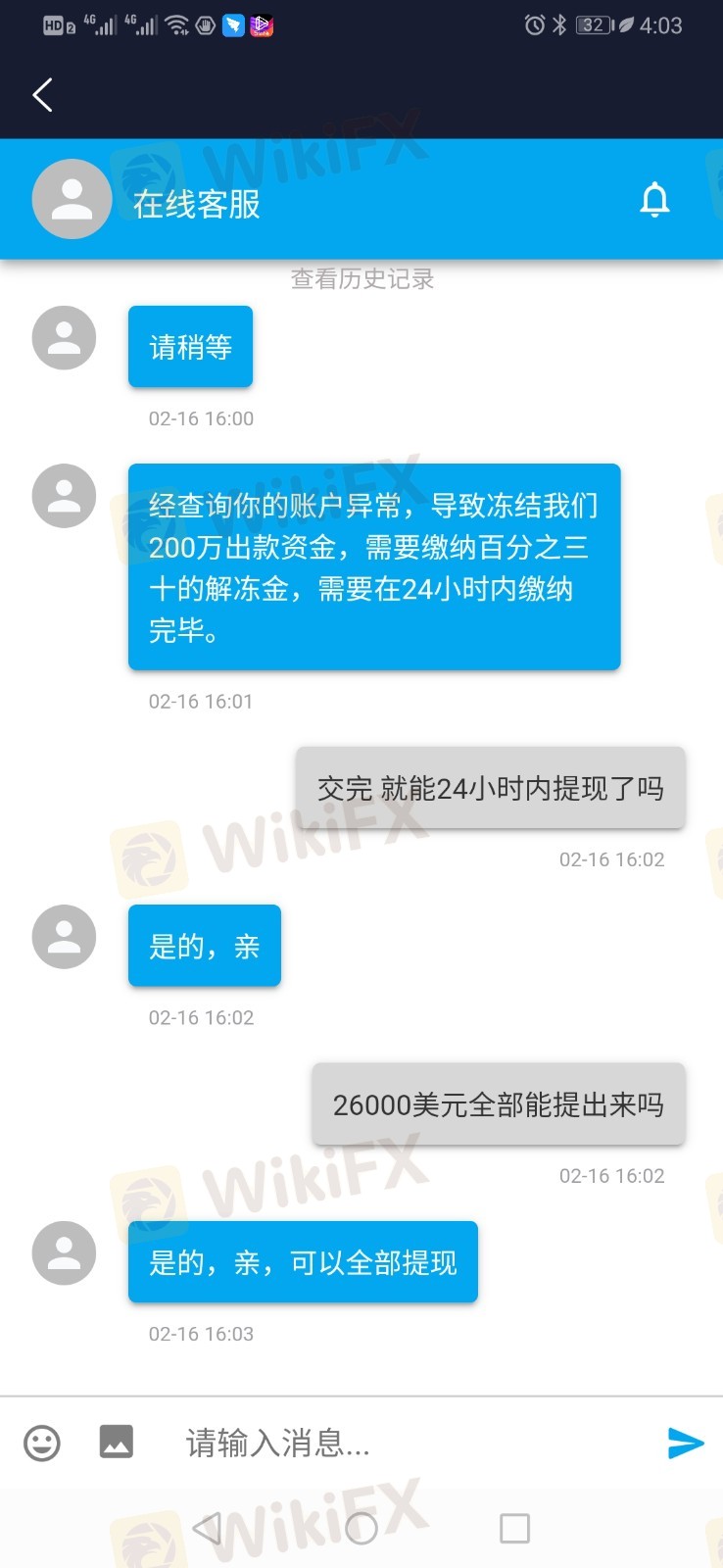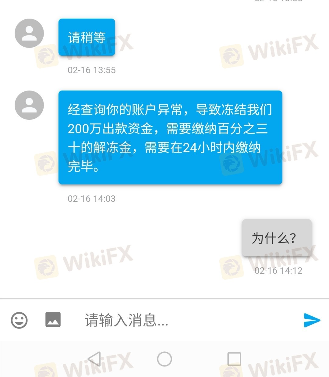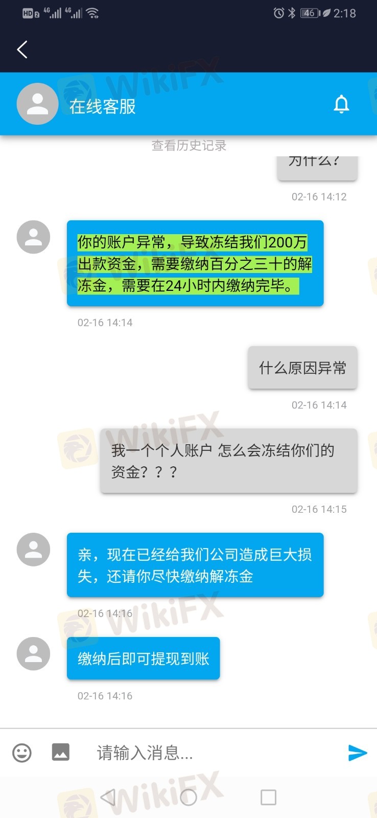 说是24小时内就可以提现,结果到了,却被拒绝。咨询客服,说账户违规,导致他们200万全冻结!要求交30%的解冻金才能提取,太可笑了,一个个人账户怎么可能影响公司账户!都是骗人的
