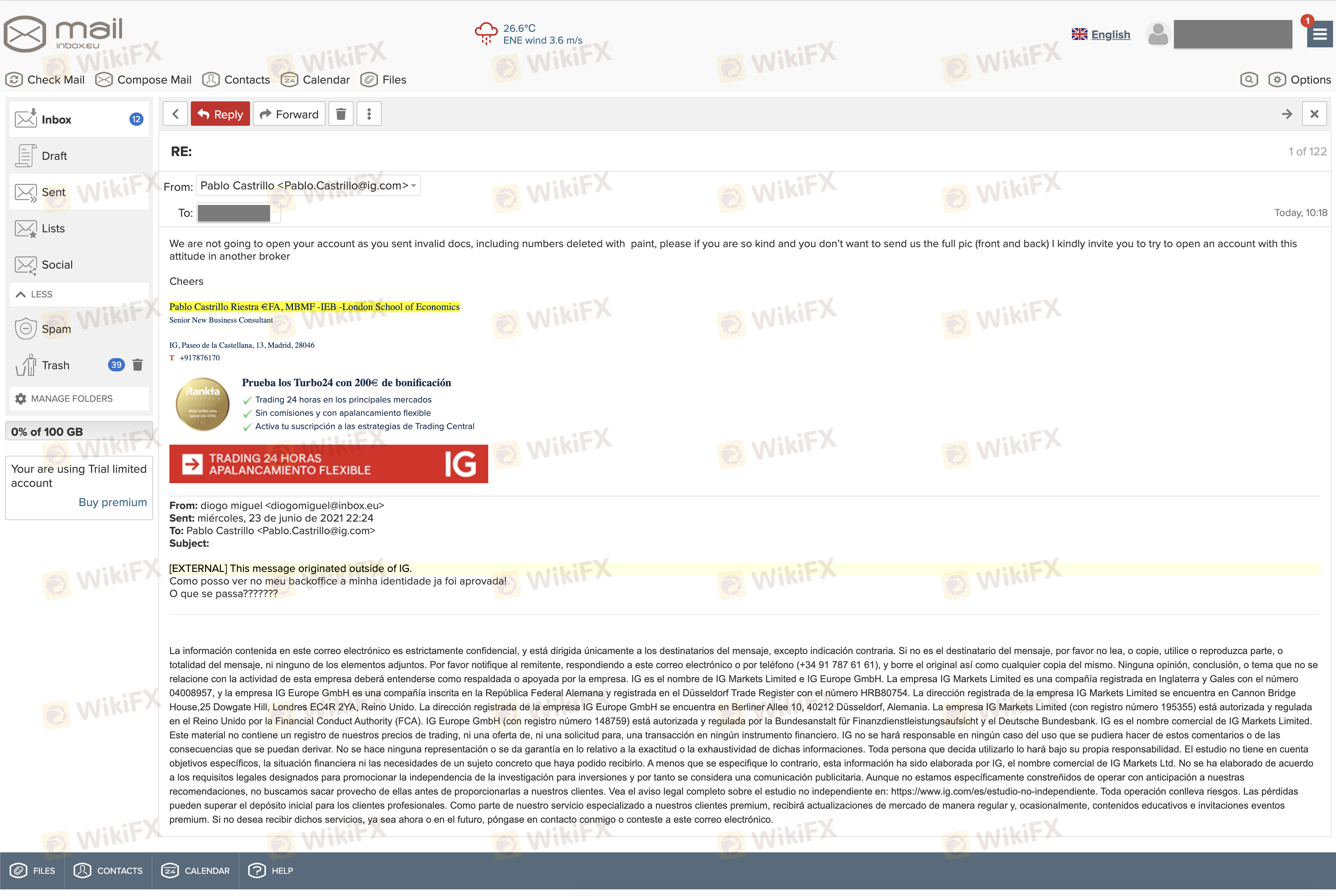 在那里开设帐户并提交所有必要和必需的文件后,我收到一封电子邮件,说要获得批准,我必须致电IG.经过多次尝试,我得以与一位西班牙代表交谈,她提到为了获得批准,我需要联系先生 Pablo Castrillo。在又一次电话会议后,我终于与他交谈,他提到我需要发送更多文件才能获得批准。我面对他的回答,我已经发送了您网站要求的所有文件,他回答说“我的分析师需要更多文件”。我向他询问有关他的分析师的信息,他拒绝透露。我发了几封电子邮件来支持我从来没有得到答复!!最后,我从 Pablo 那里得到了一个粗鲁的回答,我把它贴在这里。最后说,IG有很多因素是骗局!