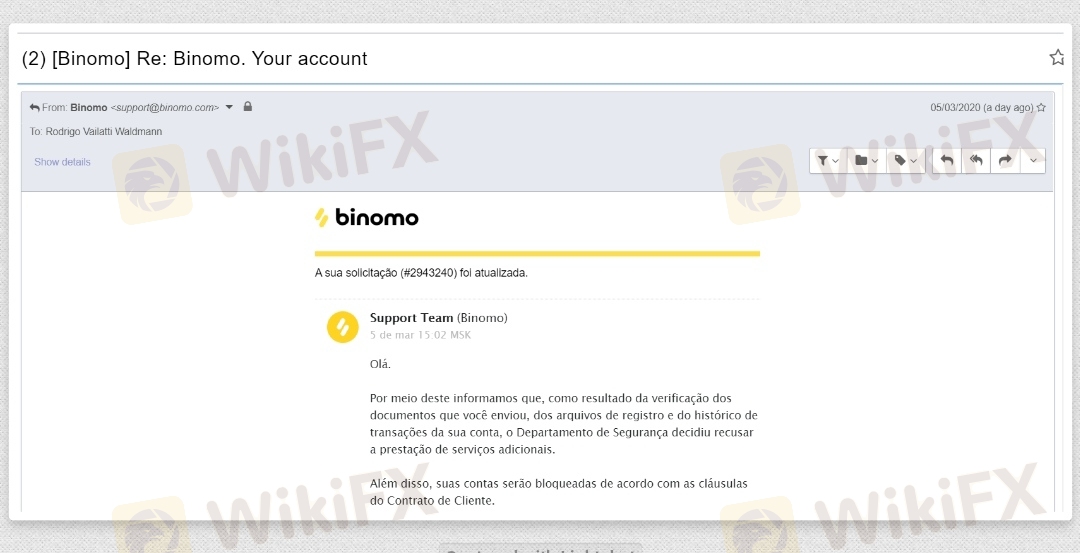 7103.95 $ Total profit of registered trades $ 205.97 Cashback Binomo $ 7,309.92 - $ 4478.00 Profit withdrawals = 2831.92 $ Balance blocked by binomo Binomo.com claims that it only blocked my account because I already had an account that they previously blocked: