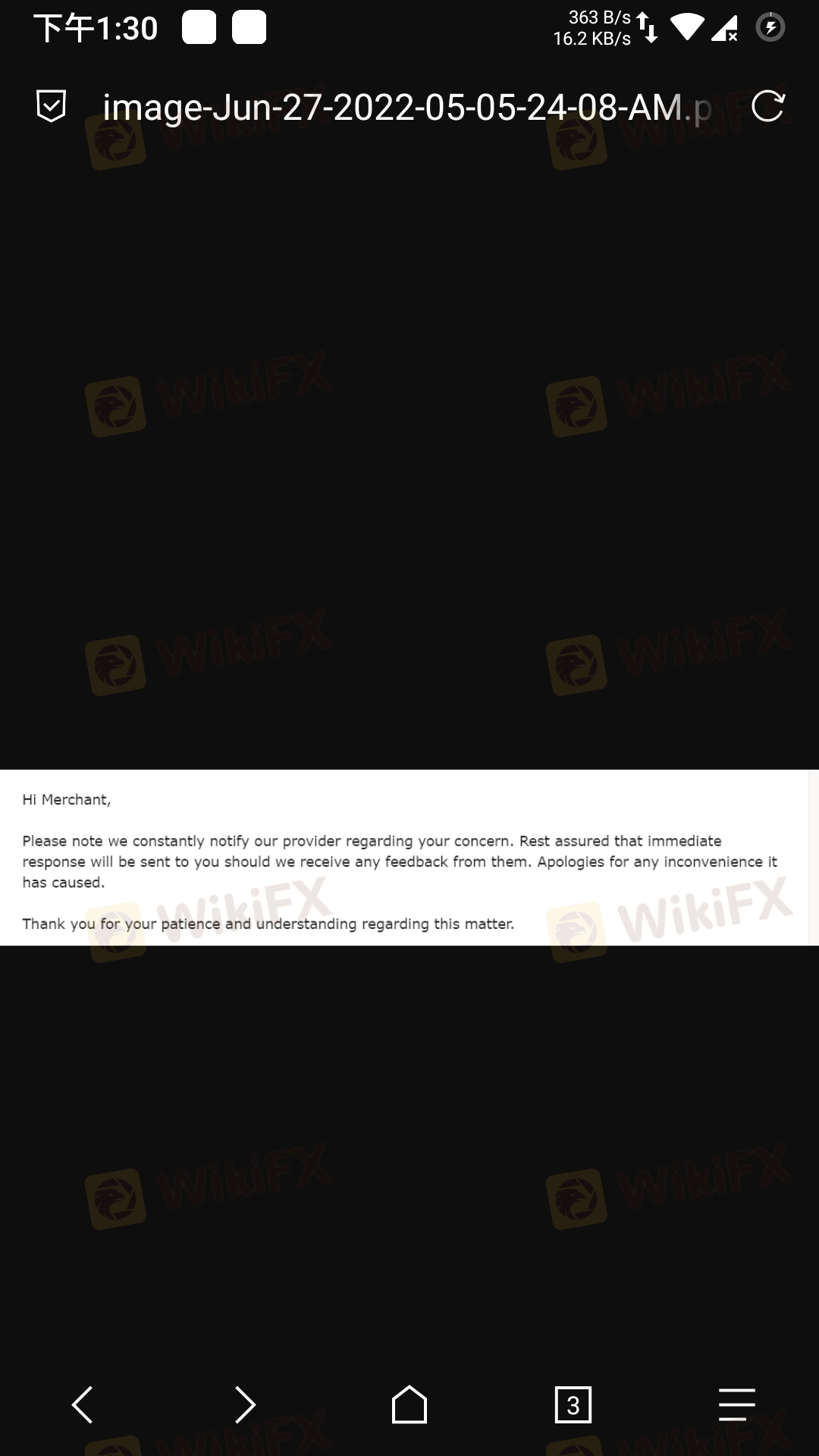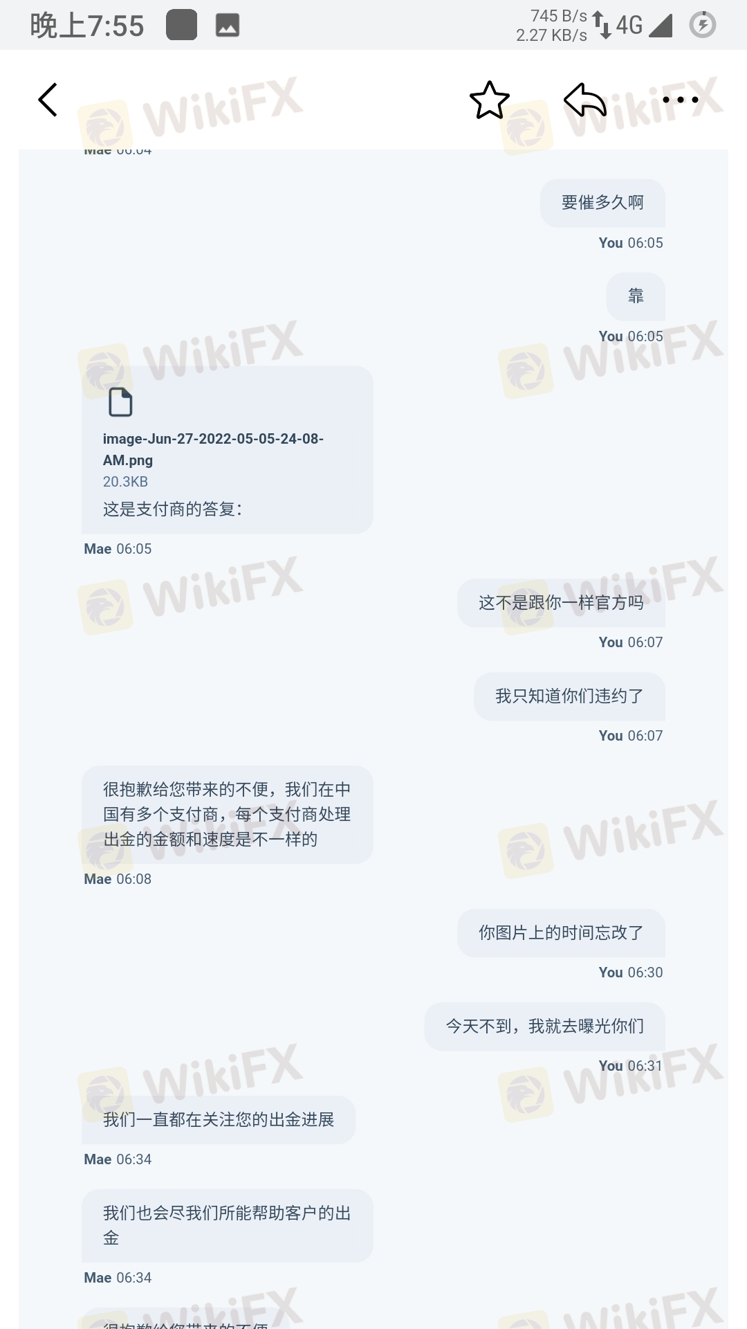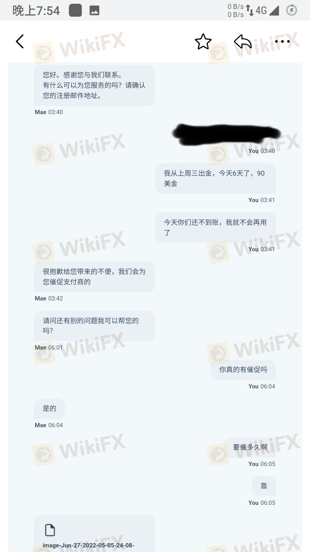 6月22日凌晨4点提起出金申请,严格来说还处在21日的盘,整个白天硬是没有审核处理,到23号下午三点才审核处理,又说要从审核处理算起,1-3天,那也应该26号就行了吧!27号了,过了自己规定的时间,又说支付商速度不同,帮我催,发个图片,光秃秃几行字,只会抱歉抱歉,也不承诺,截止日期呢,对象呢?谁知道有没有催,什么时候搞定。主要是,去年出金,从申请到打款也就三天,这马上就7天了,一个外汇交易商,出金开始困难,意味着什么呢?希望大家注意。。。