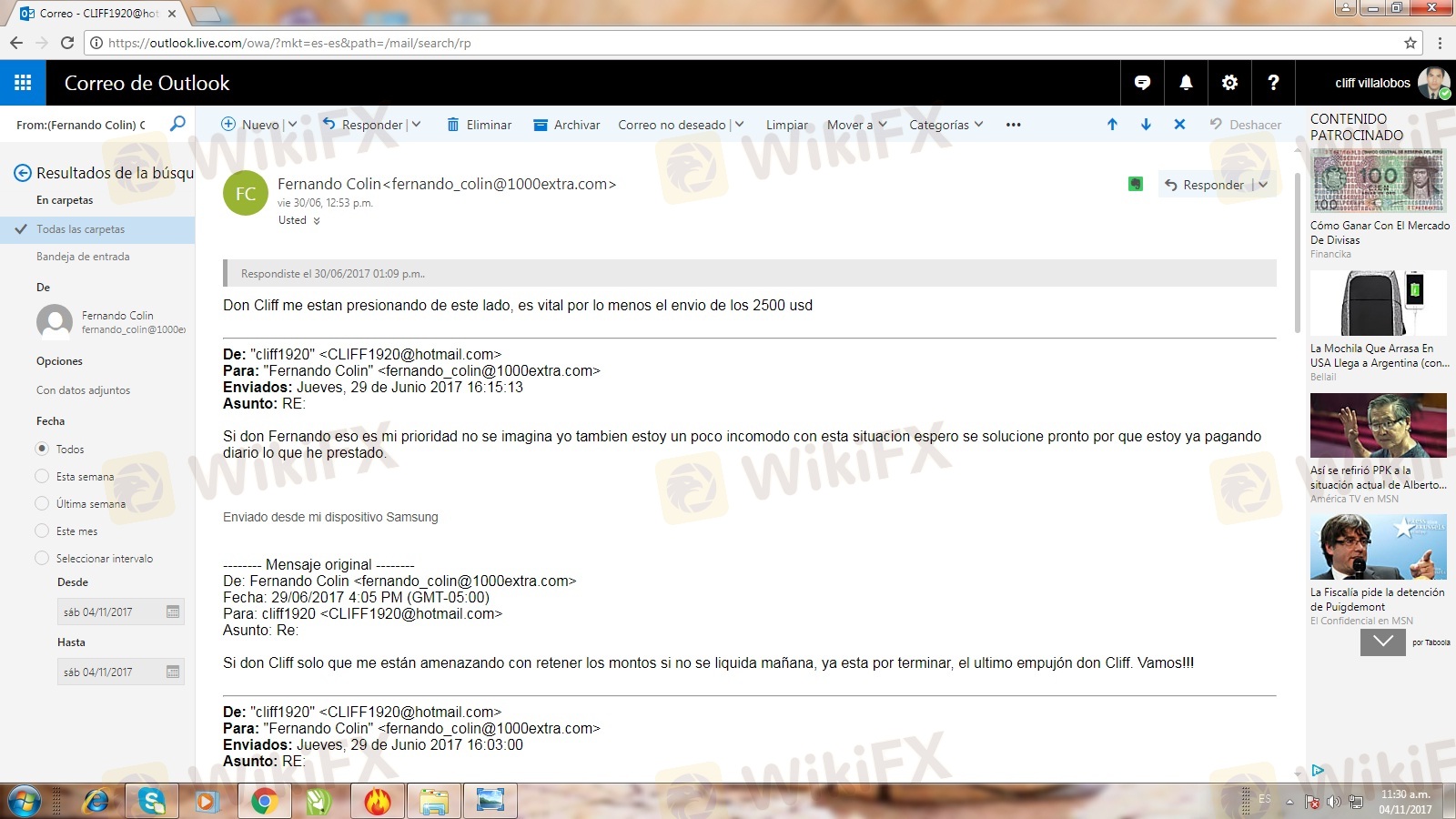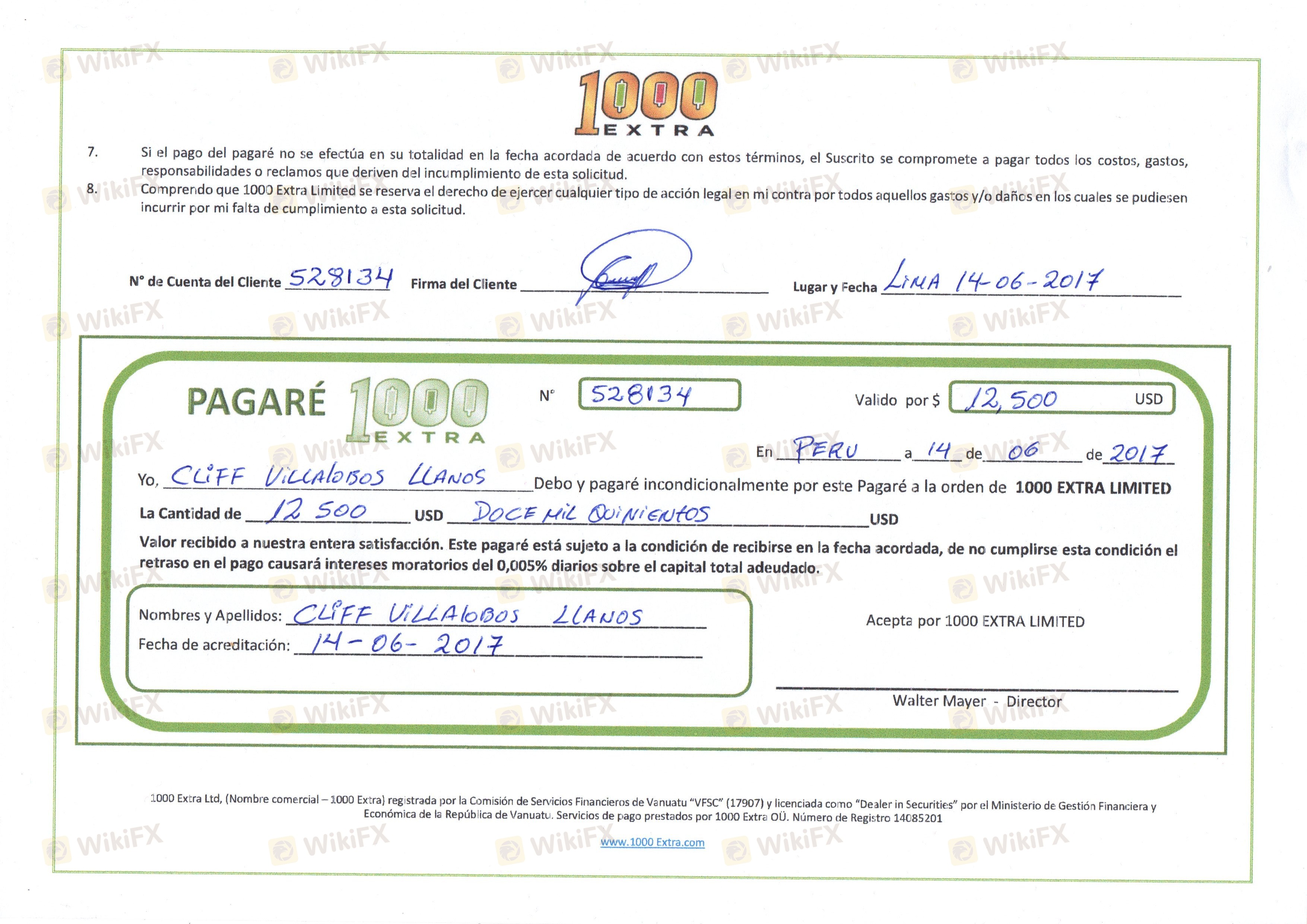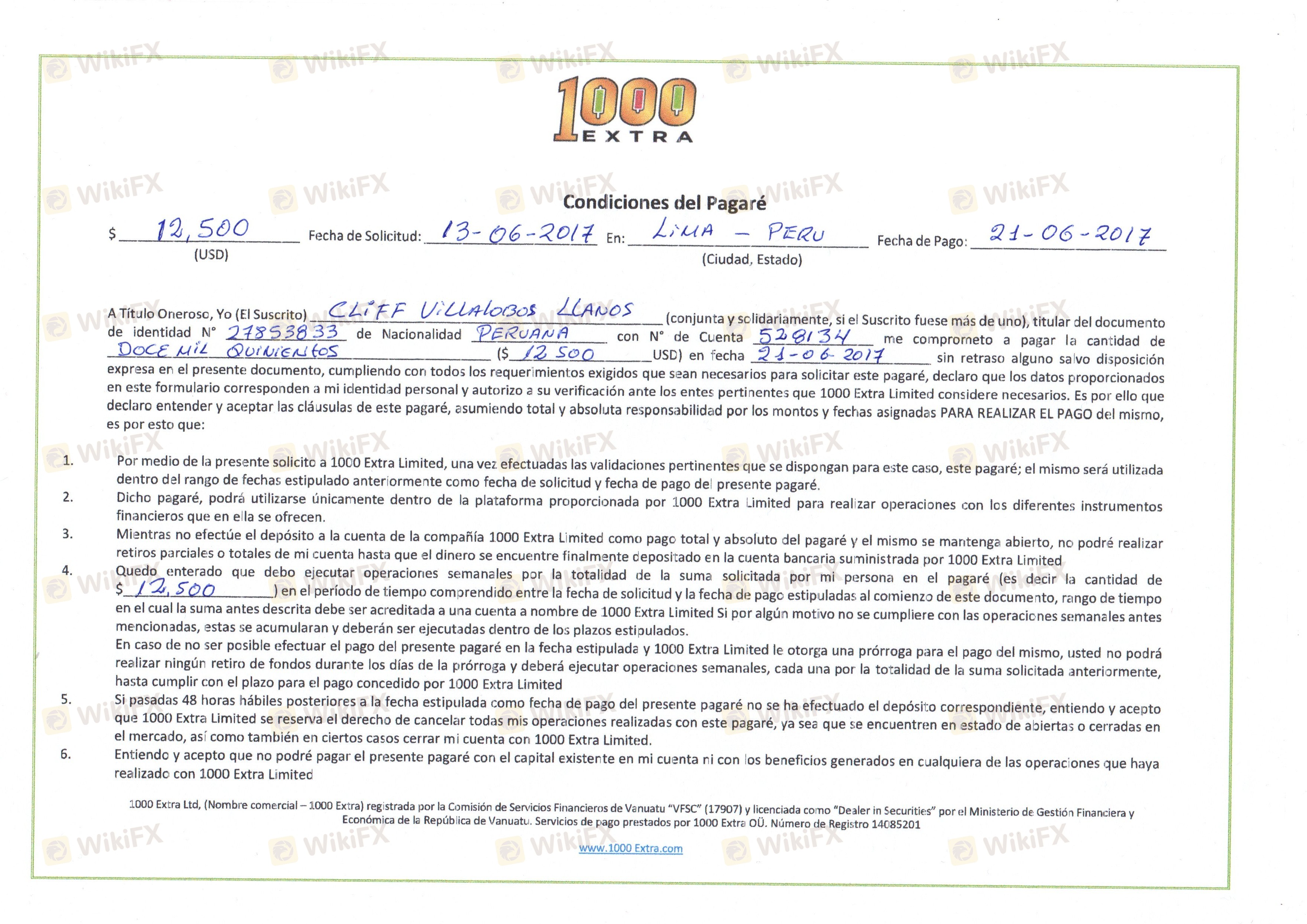 En junio del 2017 me contacto atreves de una llamada el bróker 1000extra ofreciéndome asesoramiento y manejar mi cuenta atreves de un supuesto asesor. Es así que me designaron a un asesor llamado Fernando Colin el cual me llamaba todos los días supuestamente para enseñarme como son las inversiones en bolsa hablándome de muchos números de ganancias en el mercado ya que el manejaba cuentas de varias personas dándole ganancias. es así que comencé con ellos a invertir ya que ellos trabajaban con noticias fundamentales como tasa de desempleo de Estados Unidos, las nominas agrícolas. Siempre cuando avía este tipo de noticias ellos un día antes no asían tomar una orden por grabación para que mi asesor lo haga en mi lugar. Mi asesor me ofrecía una rentabilidad del 20% de ganancias con esa operación fue así que comencé con 1,000 dólares y posteriormente lo aumente a 5,000 dólares con un pagare de 4,000 dolores eso fue todo mi capital que tenia. Pero mi asesor siempre me hablaba de aumentar mi cuenta mas para poder tener mayores ganancias. es así que en una fecha de noticias del mercado me dijo para aumentar mi cuenta de las cuales yo no tenia mas capital para invertir. En ese momento me dice que si yo no tenia mas capital que el bróker me prestaba con sus famosos pagares que son prestamos que te dan pero que en 7 días tienes que pagar ese supuesto préstamo. fue así que me ofreció 50,000 dólares el cual le dije que Hera mucho dinero que no podía devolver ese dinero luego me dijo por 25,000 tampoco le acepte de las cuales me dijo que lo iba a consultar con el área de prestamos que cuanto Hera el mínimo pasaron 2 minutos y me dijo que el avía echo lo posible que sea 12.500 dólares de las cuales me hablo muy bien que el me iba ayudar con tiempos para poder pagar ese pagare que me prestara dinero y que en una semana lo devolvía Haciendo el retiro de mi cuenta. Fue así que tome ese préstamo claro que al día siguiente estaban las ganancias pero tenia que cancelar ese préstamo para poder retirar no podía coger ni de mi capital ni de mis ganancias para poder cancelarlo solo con depósitos en efectivo. Fue así que tuve que prestarme dinero para poder pagarlo me demore mas de los 7 días por que no fue fácil conseguirlo y de su parte Hera mucho la presión me decía en los correos que si no cancelo lo antes posible me iban a cancelar la cuenta fue entonces que con mucho esfuerzo lo cancele fueron con depósitos bancarios en partes los primeros si se reflejaban en la plataforma pero el ultimo deposito demoro mucho en reflejarse luego cuando ya se reflejo me dijo que como me pase del tiempo estimado en una clausula del pagare decía que tenia que hacer operaciones por el monto prestado por una semana. es así que mi asesor me decía por que yo no savia nada del mercado que operaciones abrir y fue donde empezó las perdidas a pesar que yo le cuestionaba sobre las operaciones que estaban en negativo me decía que no me preocupara que luego el mercado se recuperara. fue ahí que perdí todo mi capital. Lamentablemente no pude hacer nada al respecto por que el gestionaba mi cuenta. Cuando se perdió todo mi capital le pedí una explicación luego se comunico conmigo por teléfono pidiéndome disculpas ya que el mercado se fue en contra y que si yo quería recuperar mi capital tenia que depositar mas dinero y si ni lo tenia me hacia un préstamo por 30,000 dólares. De las cuales era volver a lo mismo que tenia que pagar ese préstamo primero para poder retirara es donde decidí dejarlo ahí. Busque información en internet y vi que yo no era el único si no avían un montón de victimas de este bróker que asta ahora siguen estafando a mas personas pero con otro nombre. Fue una experiencia dura.