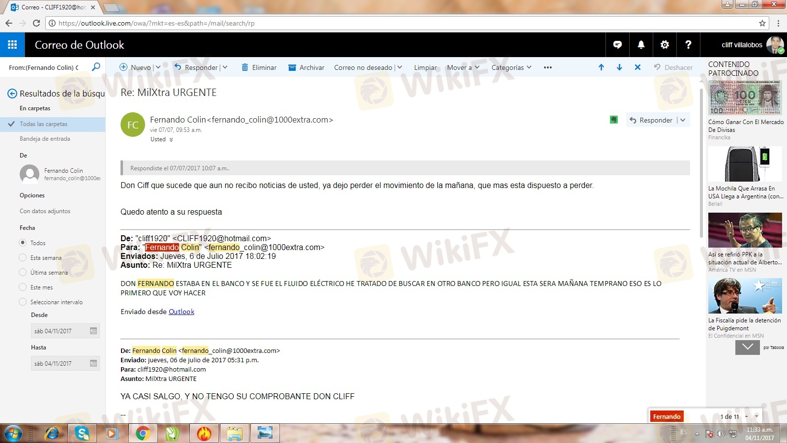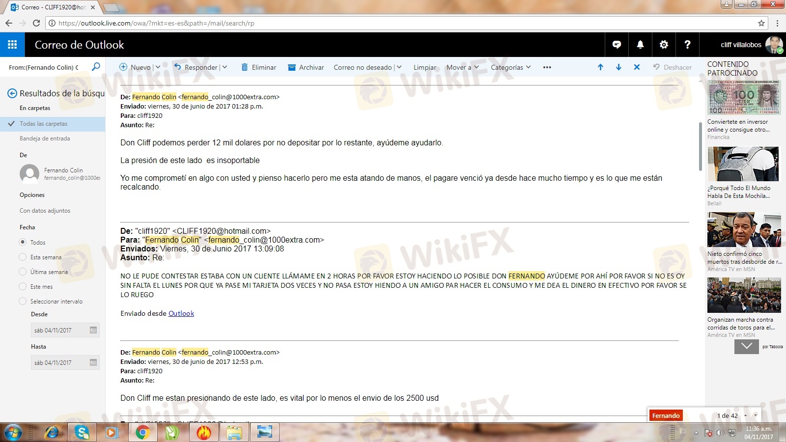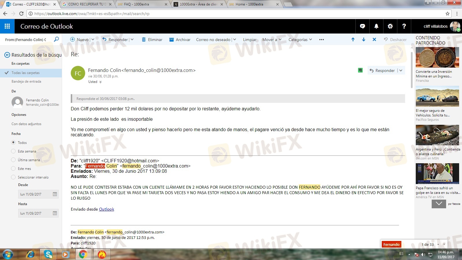En junio del 2017 me contacto atreves de una llamada el bróker 1000extra ofreciéndome asesoramiento y manejar mi cuenta atreves de un supuesto asesor. Es así que me designaron a un asesor llamado Fernando Colin el cual me llamaba todos los días supuestamente para enseñarme como son las inversiones en bolsa hablándome de muchos números de ganancias en el mercado ya que el manejaba cuentas de varias personas dándole ganancias. es así que comencé con ellos a invertir ya que ellos trabajaban con noticias fundamentales como tasa de desempleo de Estados Unidos, las nominas agrícolas. Siempre cuando avía este tipo de noticias ellos un día antes no asían tomar una orden por grabación para que mi asesor lo haga en mi lugar. Mi asesor me ofrecía una rentabilidad del 20% de ganancias con esa operación fue así que comencé con 1,000 dólares y posteriormente lo aumente a 5,000 dólares con un pagare de 4,000 dolores eso fue todo mi capital que tenia. Pero mi asesor siempre me hablaba de aumentar mi cuenta mas para poder tener mayores ganancias. es así que en una fecha de noticias del mercado me dijo para aumentar mi cuenta de las cuales yo no tenia mas capital para invertir. En ese momento me dice que si yo no tenia mas capital que el bróker me prestaba con sus famosos pagares que son prestamos que te dan pero que en 7 días tienes que pagar ese supuesto préstamo. fue así que me ofreció 50,000 dólares el cual le dije que Hera mucho dinero que no podía devolver ese dinero luego me dijo por 25,000 tampoco le acepte de las cuales me dijo que lo iba a consultar con el área de prestamos que cuanto Hera el mínimo pasaron 2 minutos y me dijo que el avía echo lo posible que sea 12.500 dólares de las cuales me hablo muy bien que el me iba ayudar con tiempos para poder pagar ese pagare que me prestara dinero y que en una semana lo devolvía Haciendo el retiro de mi cuenta. Fue así que tome ese préstamo claro que al día siguiente estaban las ganancias pero tenia que cancelar ese préstamo para poder retirar no podía coger ni de mi capital ni de mis ganancias para poder cancelarlo solo con depósitos en efectivo. Fue así que tuve que prestarme dinero para poder pagarlo me demore mas de los 7 días por que no fue fácil conseguirlo y de su parte Hera mucho la presión me decía en los correos que si no cancelo lo antes posible me iban a cancelar la cuenta fue entonces que con mucho esfuerzo lo cancele fueron con depósitos bancarios en partes los primeros si se reflejaban en la plataforma pero el ultimo deposito demoro mucho en reflejarse luego cuando ya se reflejo me dijo que como me pase del tiempo estimado en una clausula del pagare decía que tenia que hacer operaciones por el monto prestado por una semana. es así que mi asesor me decía por que yo no savia nada del mercado que operaciones abrir y fue donde empezó las perdidas a pesar que yo le cuestionaba sobre las operaciones que estaban en negativo me decía que no me preocupara que luego el mercado se recuperara. fue ahí que perdí todo mi capital. Lamentablemente no pude hacer nada al respecto por que el gestionaba mi cuenta. Cuando se perdió todo mi capital le pedí una explicación luego se comunico conmigo por teléfono pidiéndome disculpas ya que el mercado se fue en contra y que si yo quería recuperar mi capital tenia que depositar mas dinero y si ni lo tenia me hacia un préstamo por 30,000 dólares. De las cuales era volver a lo mismo que tenia que pagar ese préstamo primero para poder retirara es donde decidí dejarlo ahí. Busque información en internet y vi que yo no era el único si no avían un montón de victimas de este bróker que asta ahora siguen estafando a mas personas pero con otro nombre. Fue una experiencia dura.
