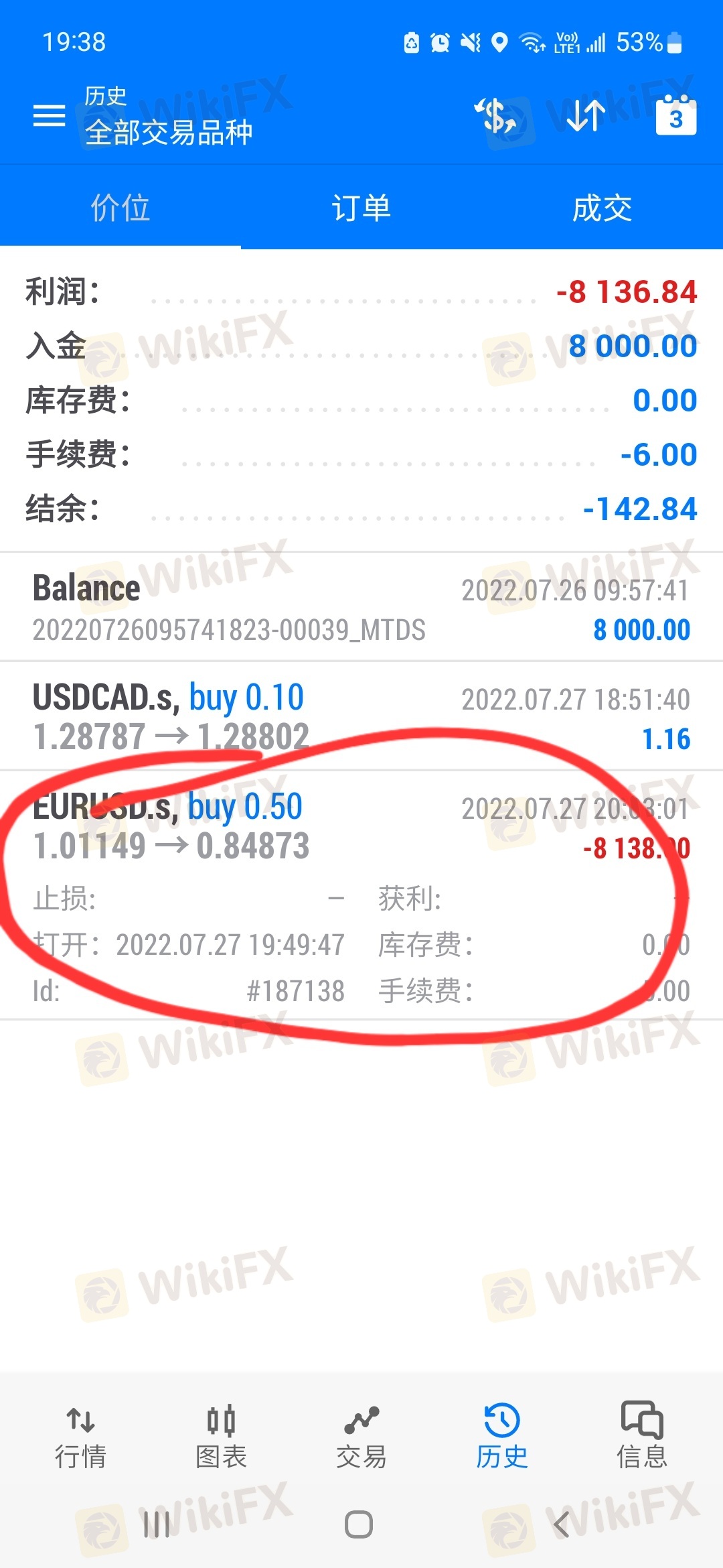 我在入金8000後两天都没操作过一次,想提款客服不给,说要交易手数五手还有5分钟才能提款,那麽我就买了eurusd ,0.5,一买就跌不过也就20美金,十分钟後一下跌到0.848.帮我直接爆仓,20年来,根本没有到过0.848,为什麽一下子下跌,但当天根本没到过跌到0.084.这黑平台是不想我取金,操作了