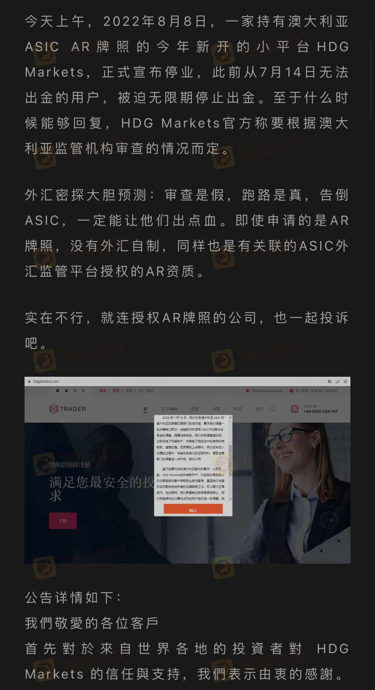 我们敬爱的各位客户 首先对於来自世界各地的投资者对 HDG Markets 的信任与支持,我们表示由衷的感谢。由於近期一部分资金来源存疑客户的资金转入与提取,导致我们目前的业务在监管的要求下不得不被迫暂停。 2022 年7月 14 日我方收到来自於澳大利亚 ASIC 以及澳大利亚笞方联合打击跨国犯罪部门的问询,要求我们对一批流向 HDG Markets 疑似存在电信欺诈、金融诈骗且使用 HDG 作为其非法隐匿赃款手段的资金展开调查。我们在收到调查要求後,第一时间冻结了可疑账户并且限制了对应账户的使用以及存取款。但遗憾的是,在两周的申诉期内,我们与该批账户持有者沟通的过程中,并未能收到有力的证明材料,从而导致监管部门对我们的调查进一步升级,目前已冻结我司位於澳大利亚国家银行(NAB)的保证金清算账户以及我司所有的流动性清算账户。 监於监管机构与澳大利亚警方的要求,从即日起,HDG Markets 所有的新设账户、衍生品合约交易服务以及客户的存取款业务暂停,直至我们配合警方完成所有的证据移交工作并得以正常运转。在此期间,希望各位投资者保持耐心,我们也将持续对此次事件的涉事账户进一步展开调查并要求其补充更多证据材料以便我们尽快完成审查。 在此期间给您带来的不便我们表示十分抱歉,也感谢您的积极理解与耐心等候。 HDG Markets 2022年8月8日 确定