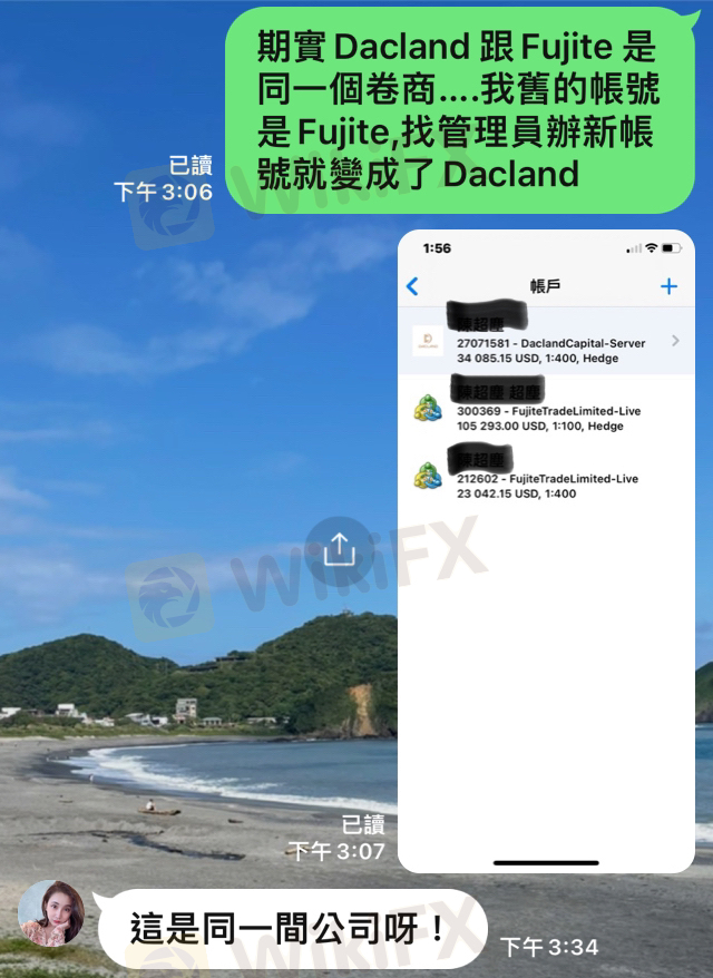 如题….Dacland 与Fujite trade 是同一间公司、同一个网路客服人员,同样也是一个黑心诈骗平台。出金会找各种理由跟缴一堆费用(税金、平台管理费、风控风险金)让交易者领不出钱。最後把帐号冻结….或是直接让交易者爆仓。 有看到的朋友记得分享一下……不要再让这种平台嚣张下去