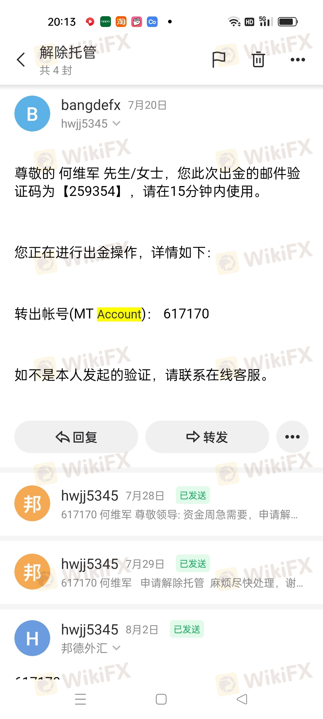 本人在2022年3月邦汇外汇投入以来,账户还有三万多美金,从2022年7月20申请出金20000美金,直至今日2022年8月19日,申请一直未成功。希望贵平台以客户诚信第一为宗旨,满足客户需求。谢谢合作,本人MT4账户617170