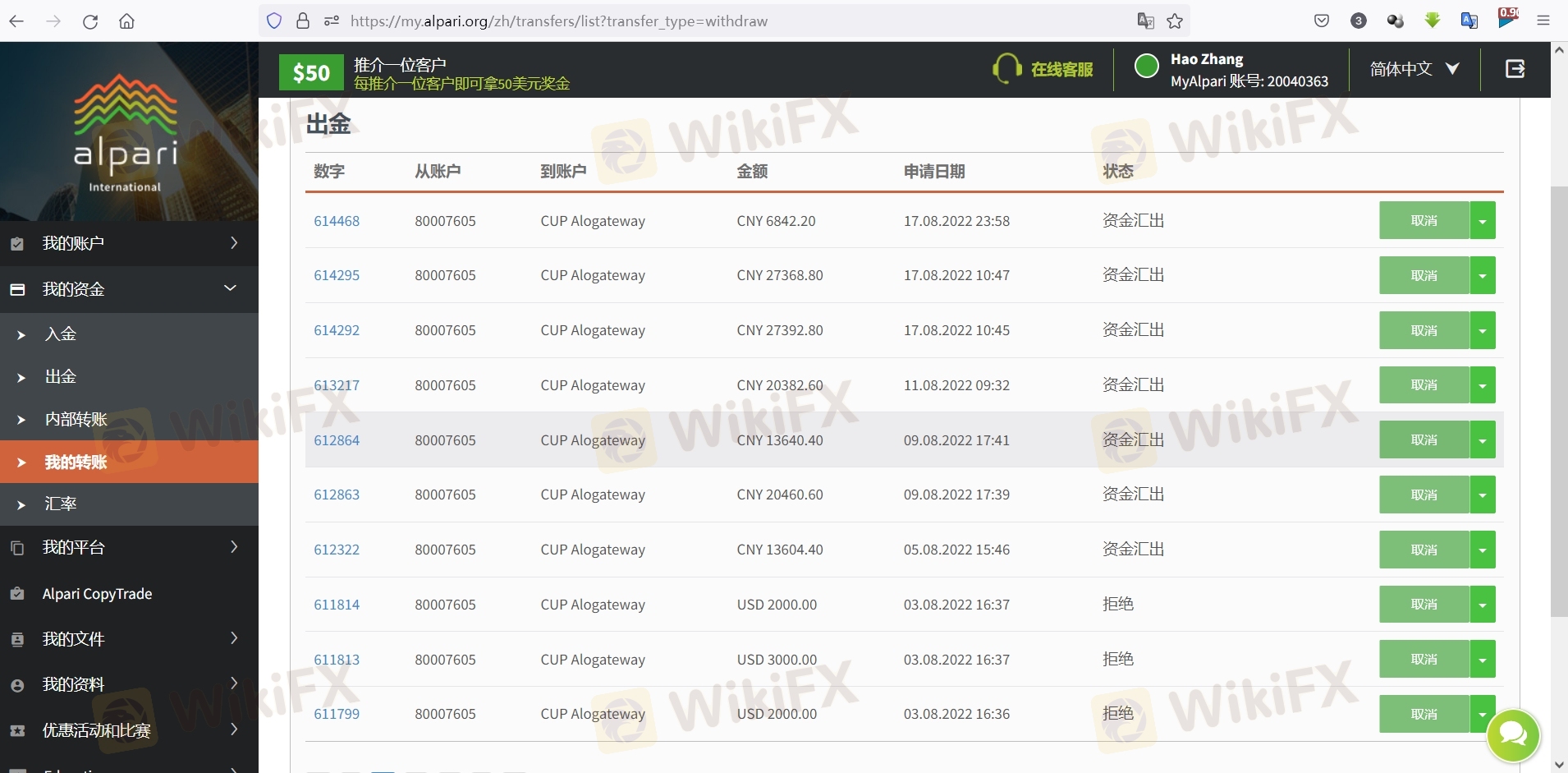 在Alpari平台申请出金共1万USD,分别在8月5号,8月9号,8月11号提交出金,截止到8月21号,没有收到任何消息,请帮忙协调处理下,谢谢。