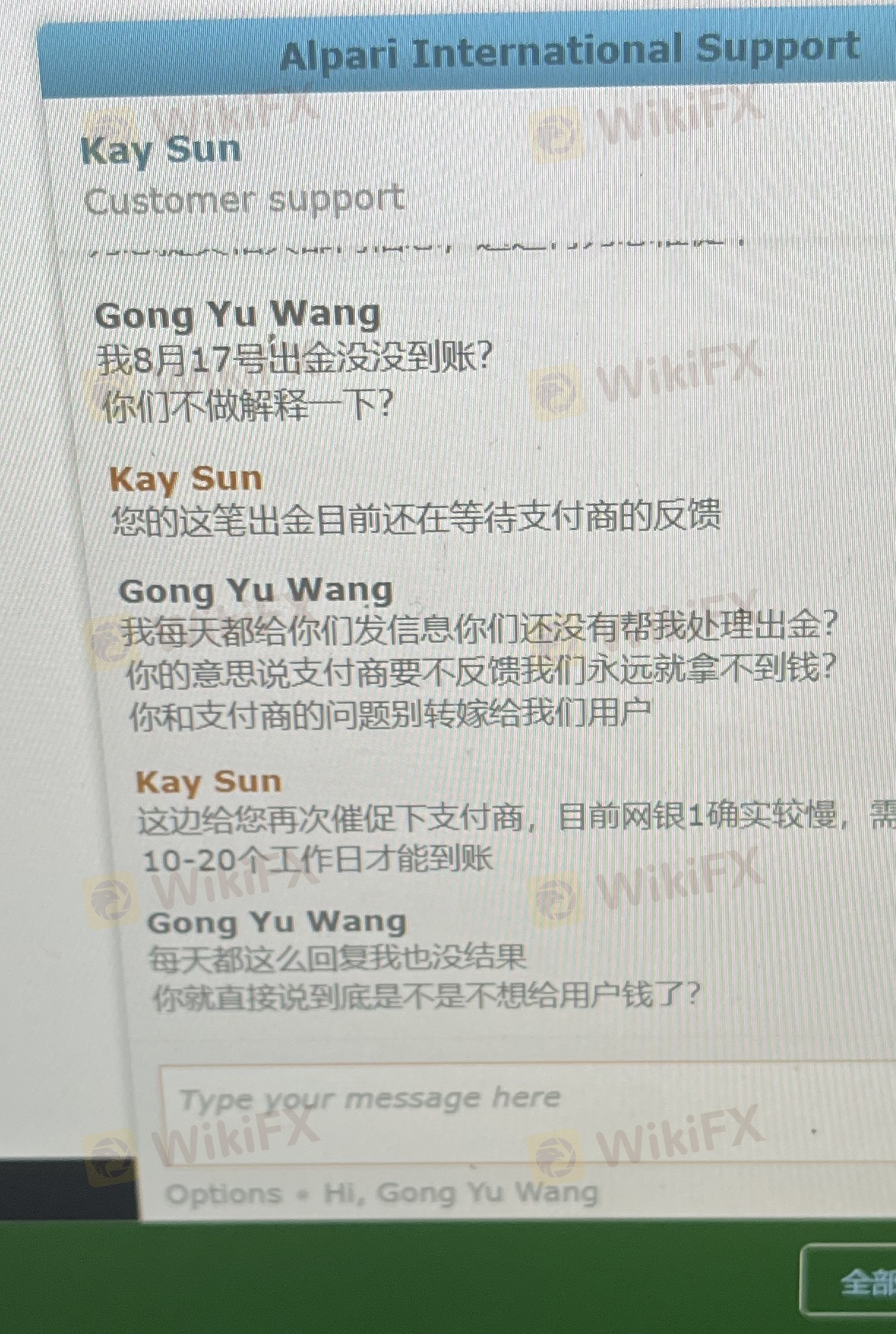 8月17日出金过来一个星期没到账我联系客服客服说让我提供银行卡流水我立即给他们发了银行卡流水,我在耐心等待一周还没到账我再次联系客服,客服又让我重新提供流水我立即发给他们,在等待一个星期后还没到账我联系客服他们就不回消息,之前承诺5日到账专门忽悠中国人的,希望中国朋友不要在上当了
