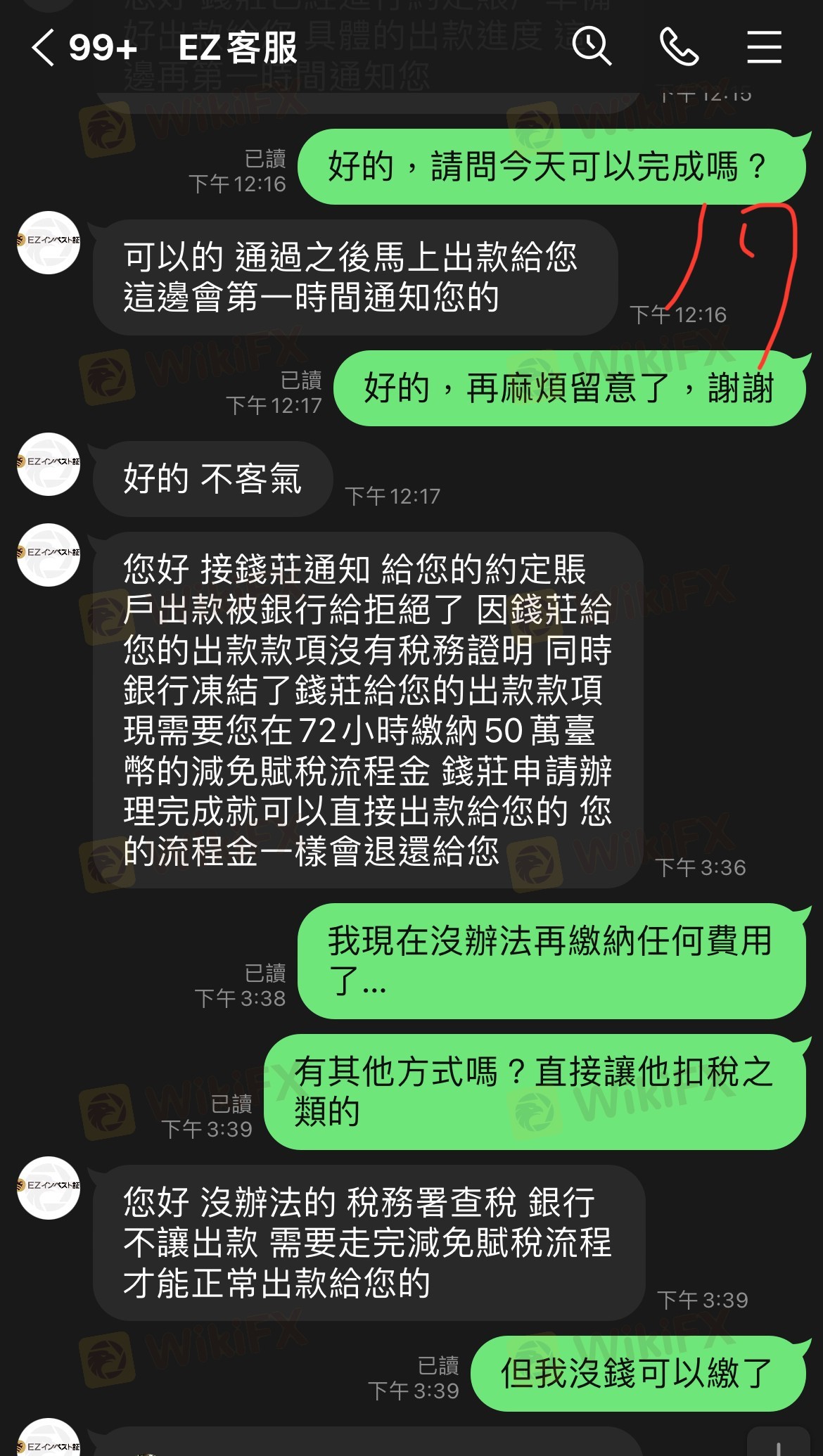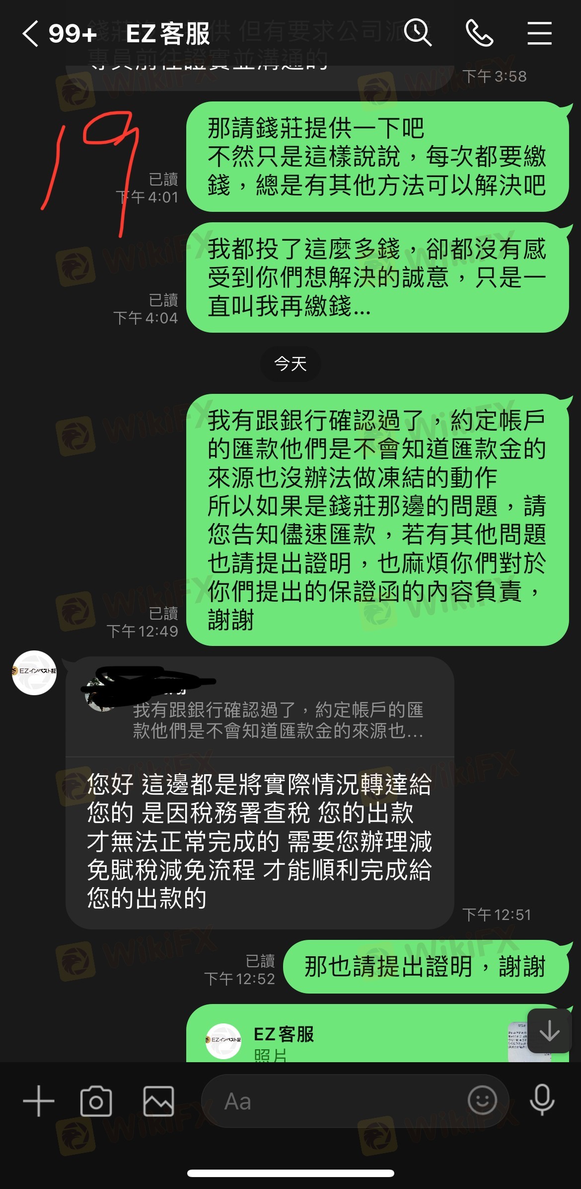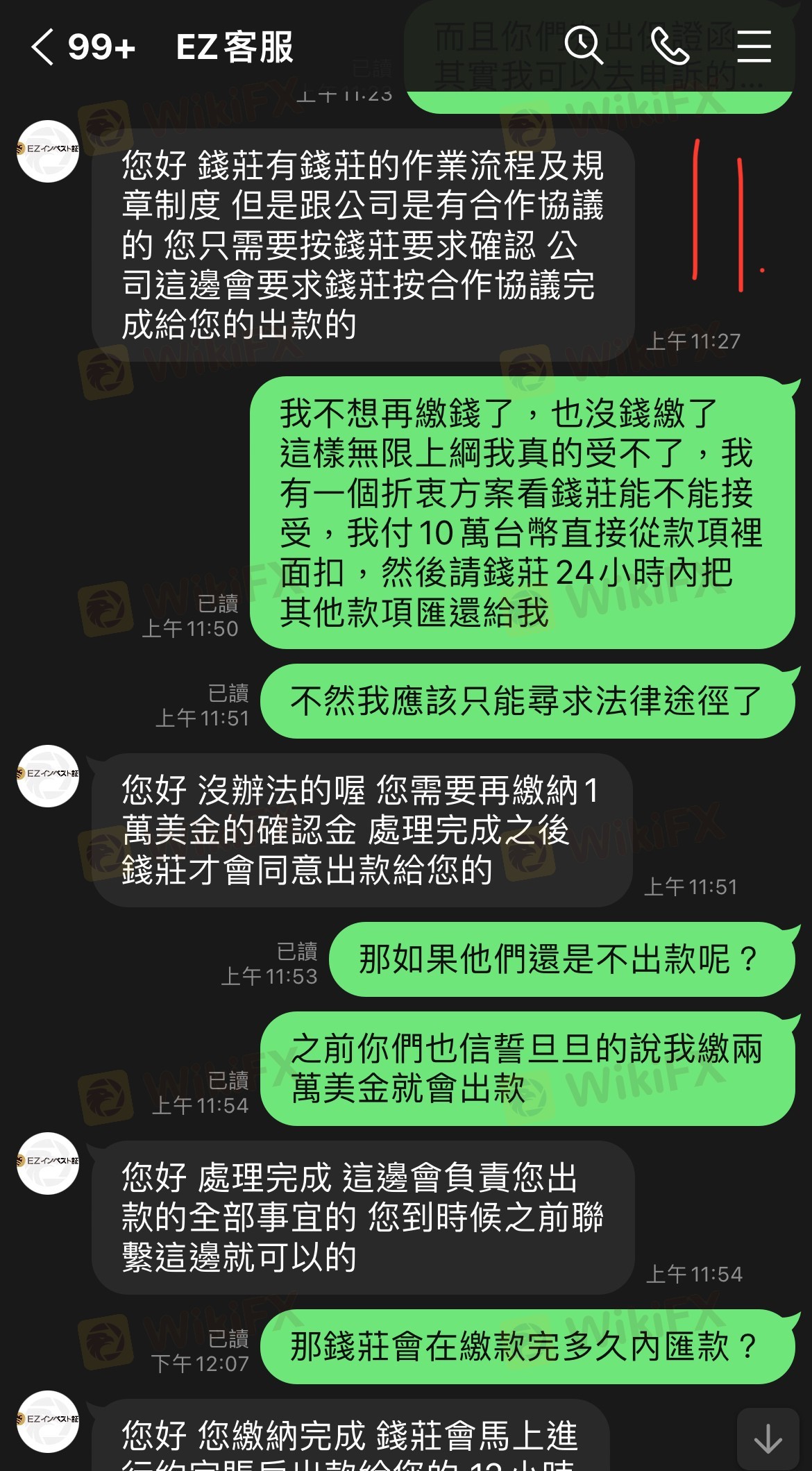 接续前一则擅自将出金交由钱庄汇款,後续持续要求缴交确认金,流程金...等各种名目的款项,并迟迟不汇款,也不履行保证函内所承诺的内容,最後说是税务机关冻结了所有款项,却还要求缴流程金才成完成汇款,总计90K USD, 连一块都没有退还