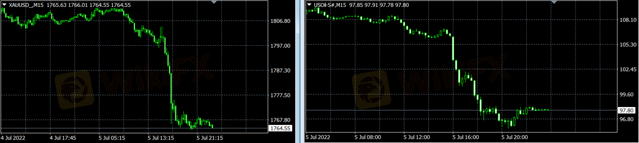 周二(7月05日),受加息及经济衰退的预期下,黄金原油断崖式下跌,美元指数则表现十分强势。因对全球经济衰退可能抑制燃料需求的担忧,盖过了对供应中断的担忧,现货原油跌穿97美元/桶,最低触及95美元/桶。而现货金主要受到美元指数走强和加息预期影响下,现货黄金收报1764.55美元/盎司,下跌42.76美元,日内最高触及1812.08美元/盎司,最低触及1764.03美元/盎司。