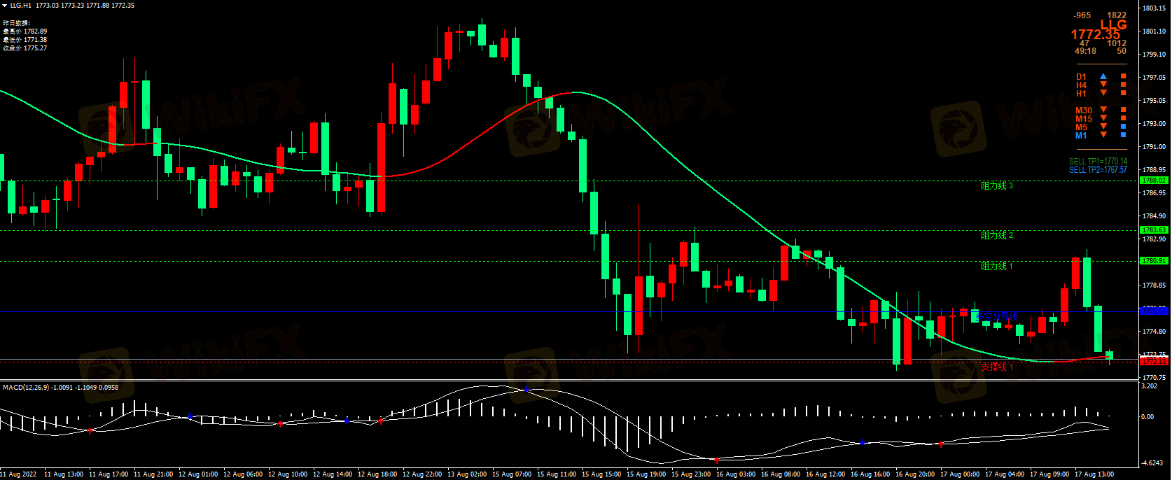 日线级别:震荡;上一交易日金价窄幅震荡,技术面信号变化不大。均线交织,MACD金叉但红色柱萎缩,短线走势变数较大,鉴于KDJ死叉,金价此前在1800关口和布林线上轨双重阻力位附近受阻,K线也录得“看跌吞没”信号,在收复10日均线1786.40阻力前,短线偏向震荡下跌,初步支撑在8月8日1770.58附近,若失守该支撑,则金价可能会进一步跌试探7月8日低点1752.36附近支撑,该位置的得失可以作为中线进一步走势的参考。