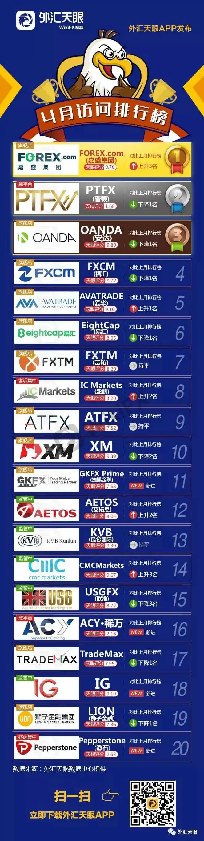 4月已悄然接近尾声,充满希望的5月即将来临。外汇天眼在月末如期发布本月交易商访问排行榜。访问排行榜是市场注意力的风向标,能及时反馈投资者的关注动向,某种程度上也是交易商活跃度的间接表现。对投资方向的选择具有一定的参考意义。