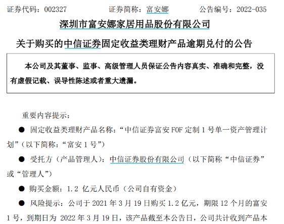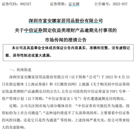富安娜购买中信资管产品违约一事有了新进展。 昨晚,富安娜发布相关澄清公告称,近期,公司关注到市场与部分媒体存在 " 中信证券有可能仅作为通道,投资标的为上市公司挑选 "" 这种违约债进不了头部券商的库,主要 ...